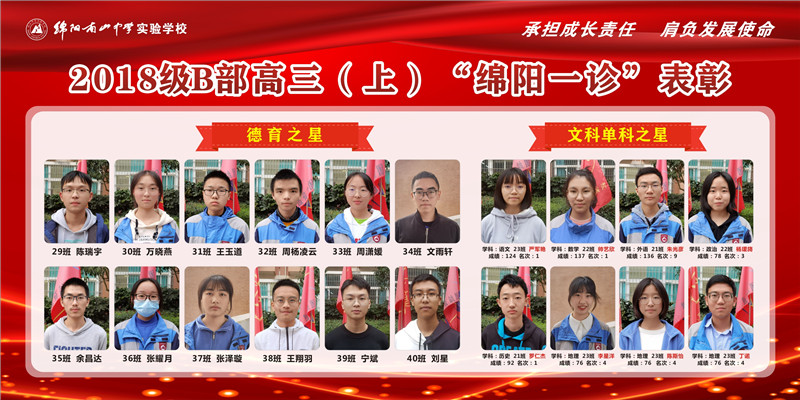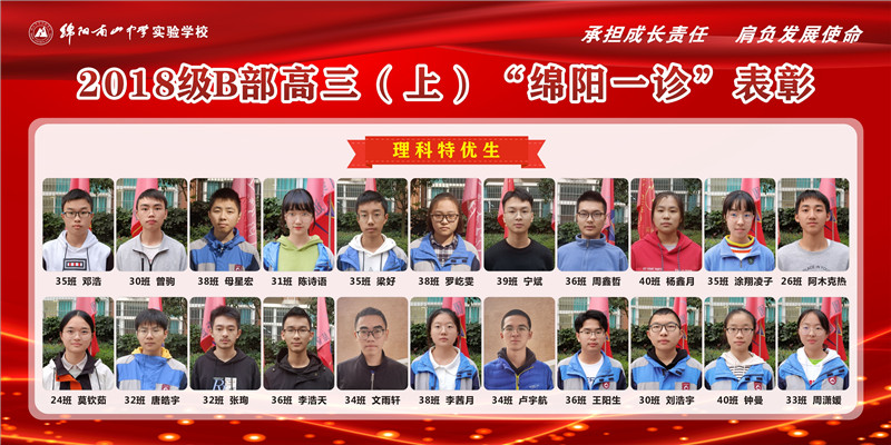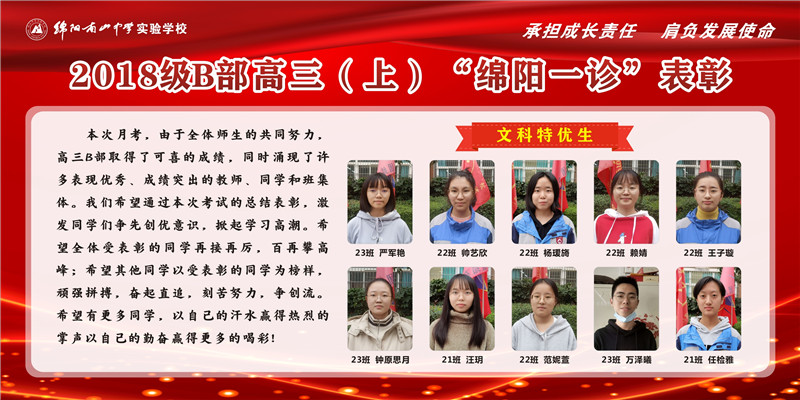 在2020年綿陽市第一次診斷考試中,高2018級(jí)B部涌現(xiàn)了許多表現(xiàn)優(yōu)秀、成績(jī)突出的教師、同學(xué)和班集體。我們希望通過本次考試的總結(jié)表彰,激發(fā)同學(xué)們爭(zhēng)先創(chuàng)優(yōu)意識(shí),掀起學(xué)習(xí)高潮。希望全體受表彰的同學(xué)再接再厲,百再攀高峰;希望其他同學(xué)以受表彰的同學(xué)為榜樣,頑強(qiáng)拼搏,奮起直追,刻苦努力,爭(zhēng)創(chuàng)流。希望有更多同學(xué),以自己的汗水贏得熱烈的掌聲以自己的勤奮贏得更多的喝彩!