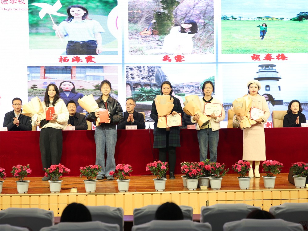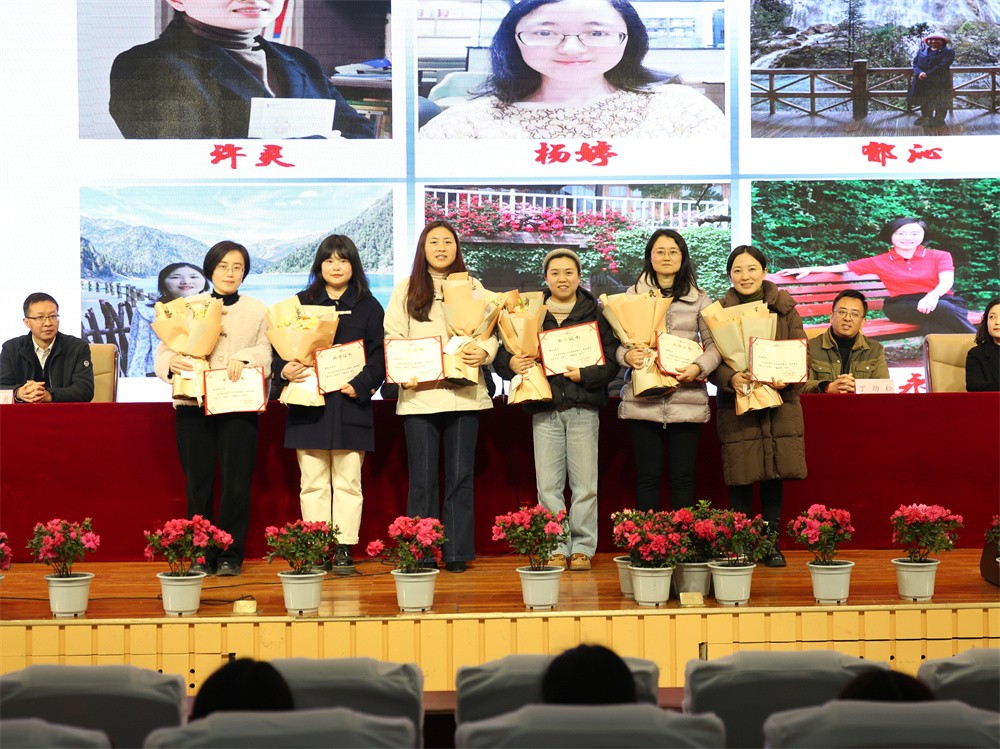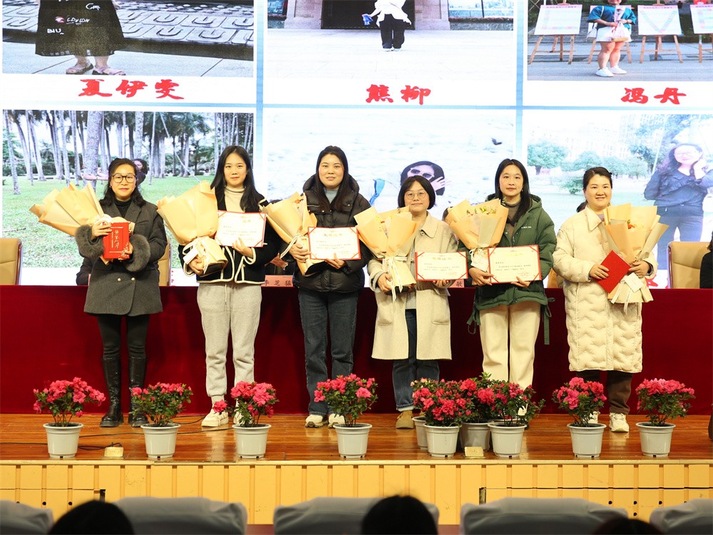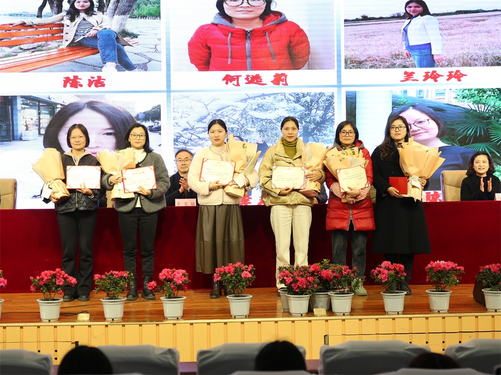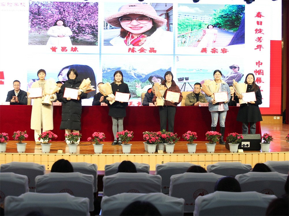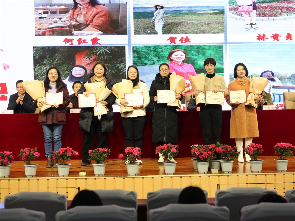 隨后,學(xué)校黨委副書(shū)記、副校長(zhǎng)杜敏宣讀了表?yè)P(yáng)文件,對(duì)在教育教學(xué)領(lǐng)域表現(xiàn)突出的巾幗模范進(jìn)行隆重表彰。這些女教職工們憑借扎實(shí)的專業(yè)知識(shí)、敬業(yè)的工作態(tài)度和對(duì)學(xué)生無(wú)微不至的關(guān)懷,成為了學(xué)校發(fā)展的中堅(jiān)力量,她們的奉獻(xiàn)精神與教育智慧,為全體師生樹(shù)立了榜樣。學(xué)校領(lǐng)導(dǎo)為獲獎(jiǎng)的女教職工頒發(fā)榮譽(yù)證書(shū)與鮮花,一束束嬌艷的鮮花,一本本燙金的榮譽(yù)證書(shū),承載著學(xué)校對(duì)女教職工的深深敬意與褒獎(jiǎng)。