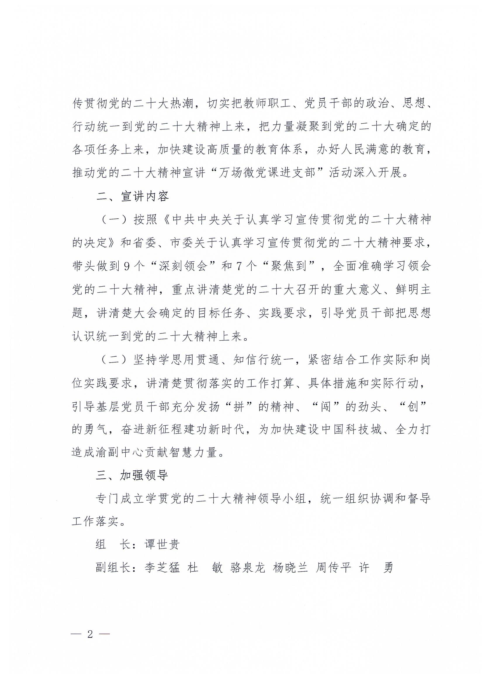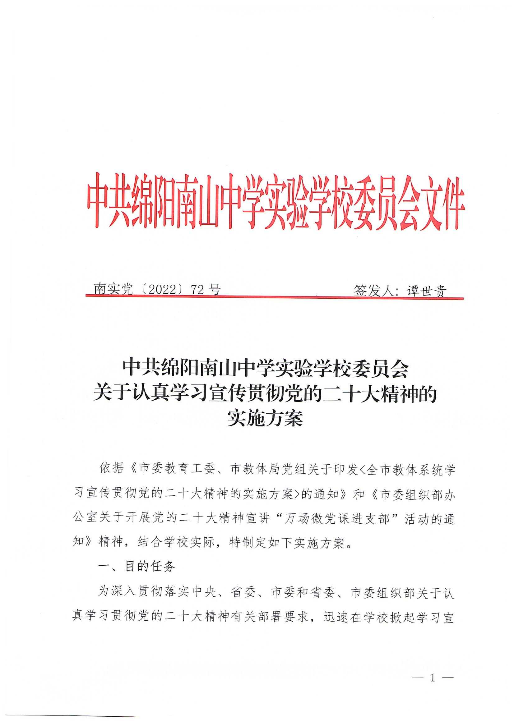 中共綿陽南山中學(xué)實(shí)驗(yàn)學(xué)校委員會(huì) 關(guān)于認(rèn)真學(xué)習(xí)宣傳貫徹黨的二十大精神的實(shí)施方案