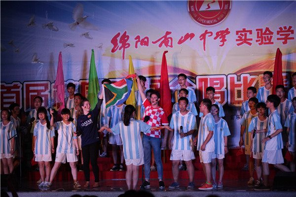 不同的班級,不同的歌曲與表演形式,精彩紛呈。高一14班同學帶來的一曲《愛》,充滿青春的氣息,節(jié)奏鮮明,動作協(xié)調,配以誦讀、手語等多元素,讓人眼前一亮;高一7班的《黃河大合唱》一反歌曲鏗鏘雄渾的原有印象,用輕松詼諧的形式呈現他們心中構想的《保衛(wèi)黃河》,點燃了現場觀眾的激情。此外,高二33班邀請到兩位外教助陣演唱,高二2班集體演唱本班同學原創(chuàng)的歌曲《度校光年》,為全場師生帶來了一場聽覺與視覺的盛宴。